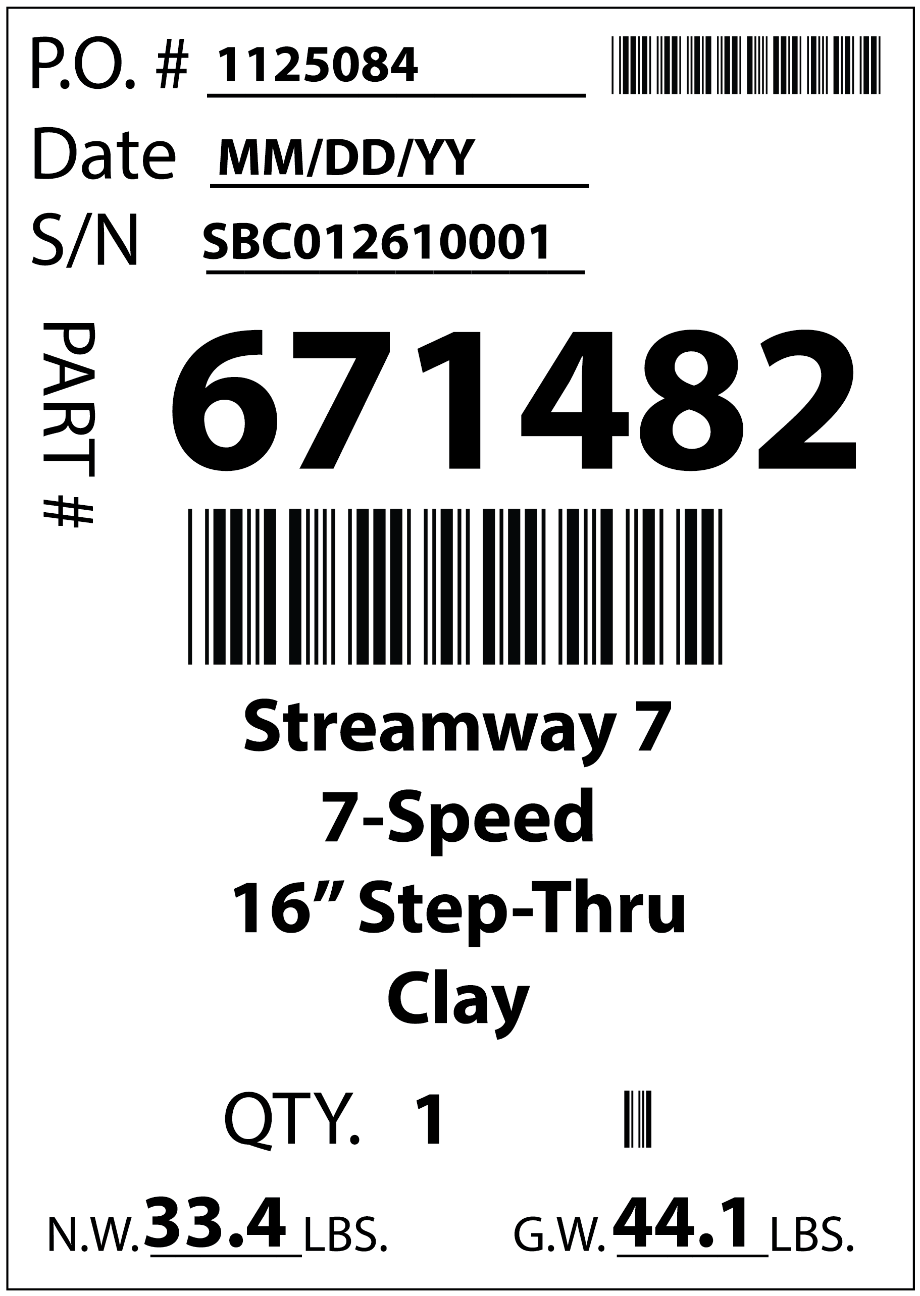 | N.W. __ LBS. | Weight in LBS. of assembled bike without packaging |